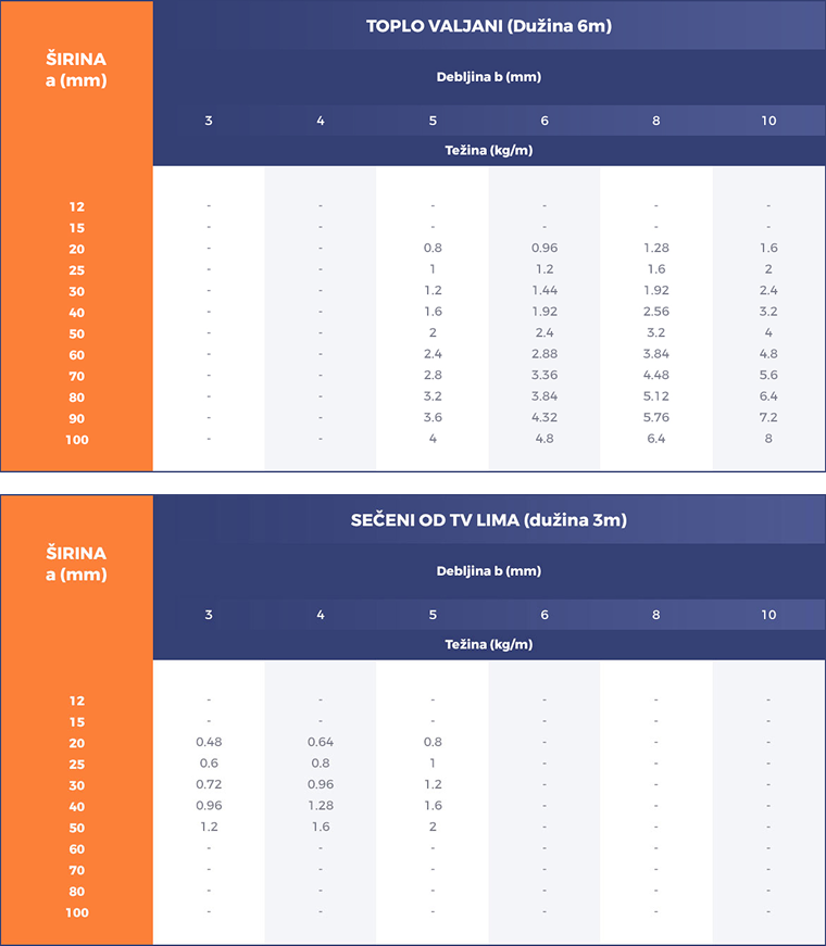 - Orijentaciona težina se računa po formuli: a(mm) × b(mm) × dužina (m) × 8 / 1000