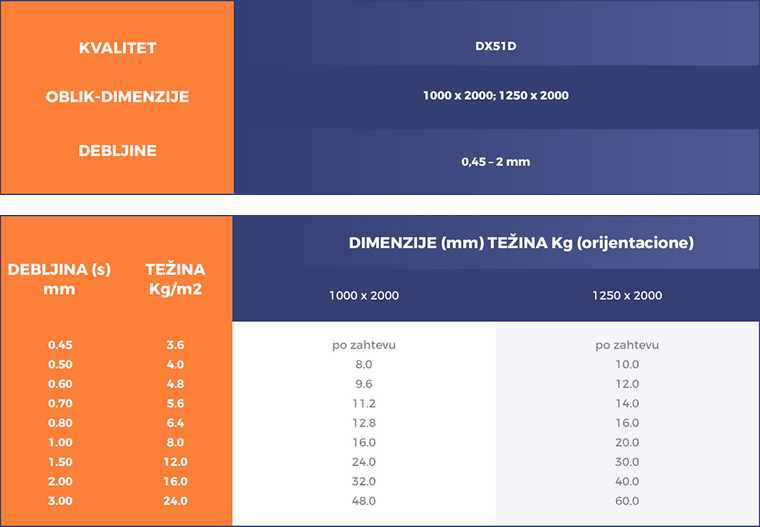 - Pocinkovani limovi – standardna varijanta (DX51D) za opštu primenu i dalju obradu.
