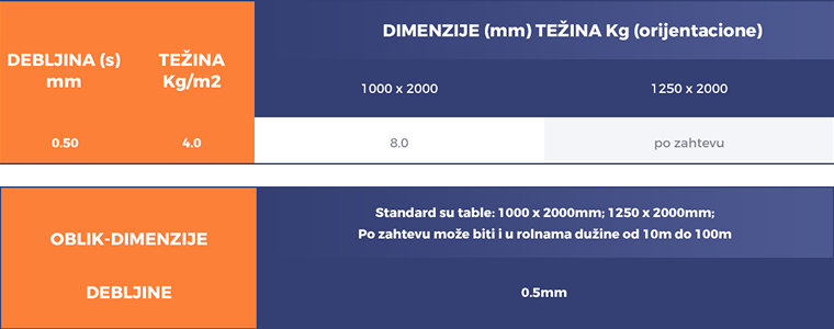 - Plastificirani bojeni limovi – pocinkovana osnova sa zaštitno-dekorativnim slojem; dostupno u tablama, a po zahtevu i u rolama (10–100 m).