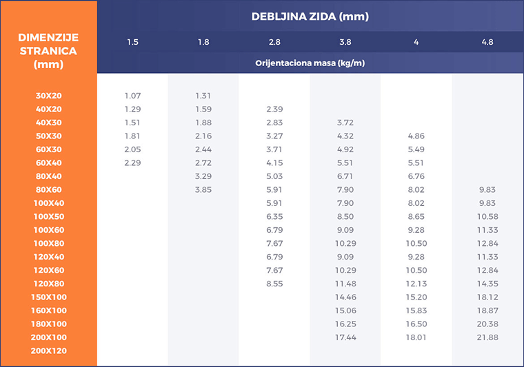 Mase prikazane u tabeli su orijentacione (kg/m) i mogu imati manja odstupanja u okviru tolerancija i zavisno od serije materijala. Za veće projekte i precizne proračune preporučuje se potvrda specifikacije prema zahtevu projekta.