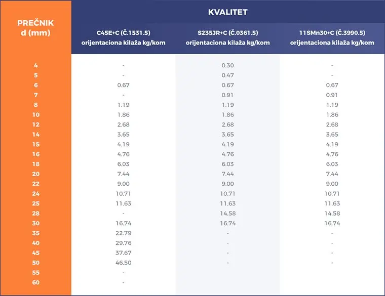 - Približna težina se računa po formuli: fi(mm) × fi(mm) × L(m) × 0,62 / 100